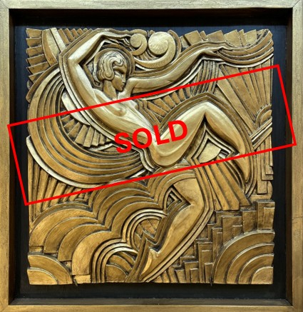 Maurice Picaud, dit Pico (1900-1977) est un architecte, décorateur et peintre français formé à l'École Boulle. Collaborateur de Jacques-Émile Ruhlmann, il s'est également illustré comme caricaturiste de presse. Parmi ses œuvres ancrées dans l'Art Déco, on compte la célèbre façade des Folies Bergère à Paris (1926), représentant la danseuse russe Lila Nikolska. Il a également réalisé des peintures murales pour l'hôtel de ville de Montdidier dans les années 1930. “Danseuse nue” Réduction de la façade des Folies Bergère. Bas-relief en stuc doré. Cadre en bois noirci. Tirage posthume. Dimensions H : 59 cm ; L : 56,5 cm ; P : 4,5 cm Maurice Picaud, known as Pico (1900-1977), was a French architect, decorator, and painter trained at the École Boulle. A collaborator of Jacques-Émile RUHLMANN, he also made a name for himself as a press caricaturist. Among his works rooted in the Art Deco movement, the most famous is the façade of the Folies Bergère in Paris (1926), depicting the Russian dancer Lila Nikolska. He also created murals for the Montdidier town hall in the 1930s. “Nude dancer” Reduced version of the Folies Bergère façade. Gilded stucco bas-relief. Blackened wood. Posthumous edition. Dimensions H : 59 cm ; W : 56,5 cm ; P : 4,5 cm H : 23.2 in ; W : 22.2 in ; D : 1.8 in